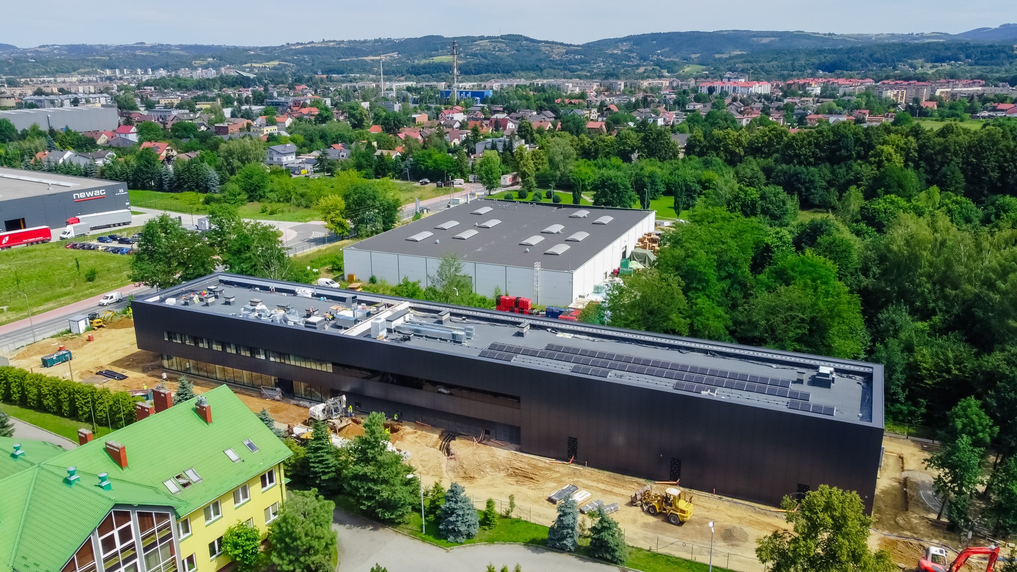 Realizacja nowej siedziby Archiwum Narodowego w Nowym Sączu to projekt o wyjątkowych wymaganiach technicznych, będący przykładem budownictwa pasywnego o dużej skali. Nasz zespół zapewnił precyzyjne wsparcie geodezyjne przy wytyczaniu fundamentów i osi konstrukcyjnych obiektu, który musi sprostać ogromnym obciążeniom przechowywanych dokumentów. Zakres prac objął bieżący monitoring geometryczny wznoszonych konstrukcji oraz precyzyjne pomiary pod montaż nowoczesnej elewacji i systemów klimatyzacji precyzyjnej. Wykorzystanie technologii dronów (widoczne na ujęciach DJI_0756-Pano) pozwoliło na regularne generowanie ortofotomap i monitoring postępu prac na całym placu budowy. Inwestycję zwieńczyła szczegółowa inwentaryzacja powykonawcza, dokumentująca wysoką jakość wykonania tego strategicznego obiektu użyteczności publicznej.