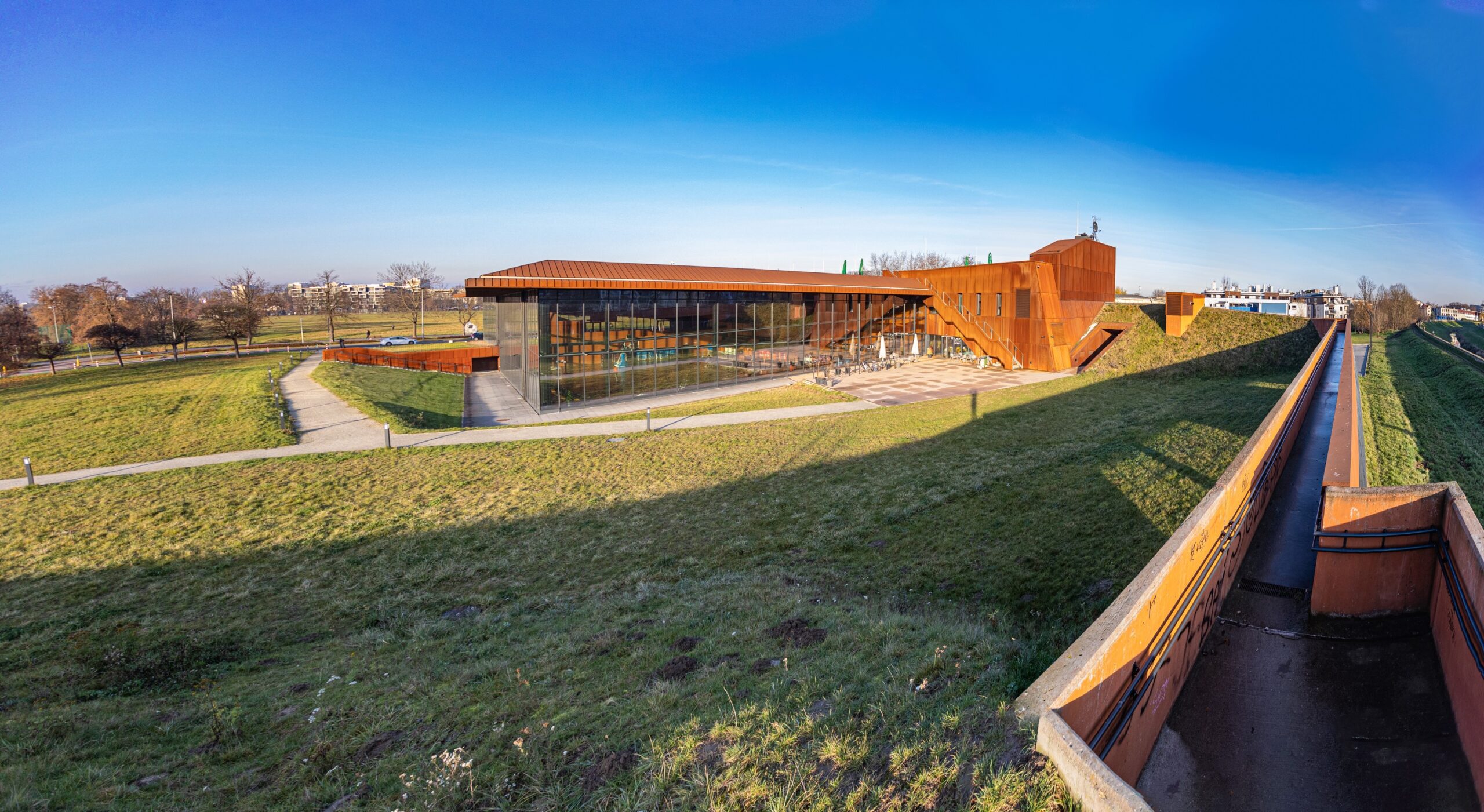 Realizacja tego prestiżowego obiektu o nowoczesnej bryle wymagała od naszego zespołu najwyższej precyzji w wytyczaniu skomplikowanej geometrii fundamentów oraz stalowej konstrukcji dachu. Prowadziliśmy bieżącą kontrolę pionowości elementów elewacyjnych oraz precyzyjne pomiary pod montaż wielkopowierzchniowych przeszkleń. Prace zwieńczyła szczegółowa inwentaryzacja powykonawcza terenu wokół hali, obejmująca infrastrukturę techniczną i drogi dojazdowe, zapewniając pełną zgodność z ambitną wizją projektową.