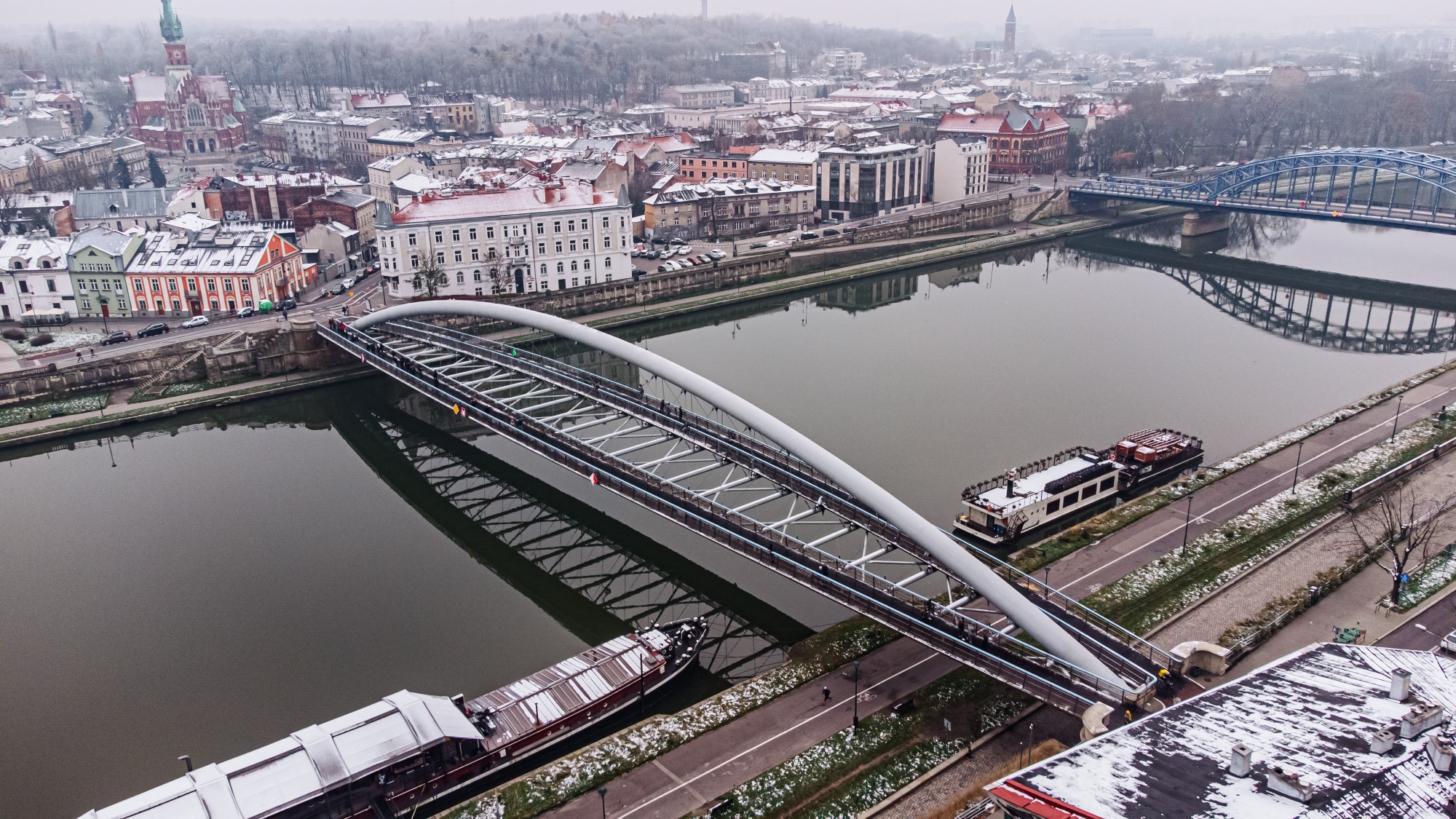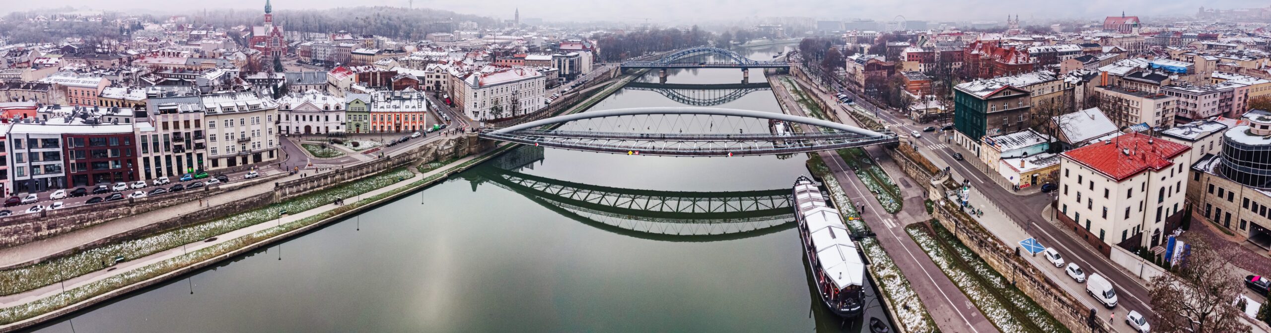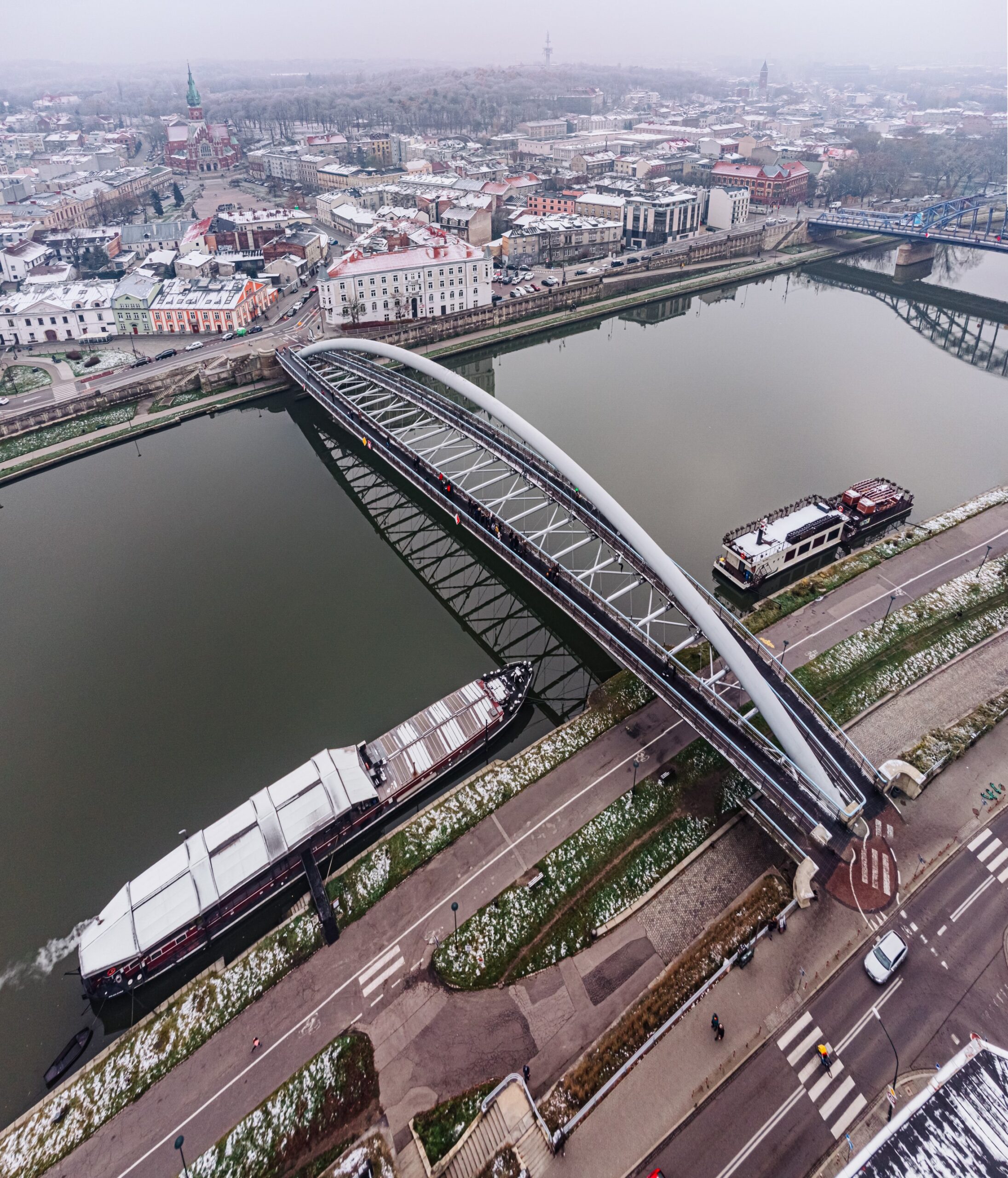 Realizacja Kładki Ojca Bernatka, łączącej krakowski Kazimierz z Podgórzem, wymagała od naszego zespołu zapewnienia najwyższej precyzji pomiarowej podczas montażu skomplikowanej konstrukcji stalowej nad Wisłą. Zakres prac objął precyzyjne wytyczenie podpór mostowych oraz stały monitoring geometryczny łuku głównego i pomostów podczas scalania poszczególnych sekcji konstrukcji. Wykonaliśmy również szczegółową inwentaryzację powykonawczą całego obiektu wraz z infrastrukturą towarzyszącą, gwarantując pełne bezpieczeństwo użytkowania oraz absolutną zgodność z unikalnym projektem architektonicznym.