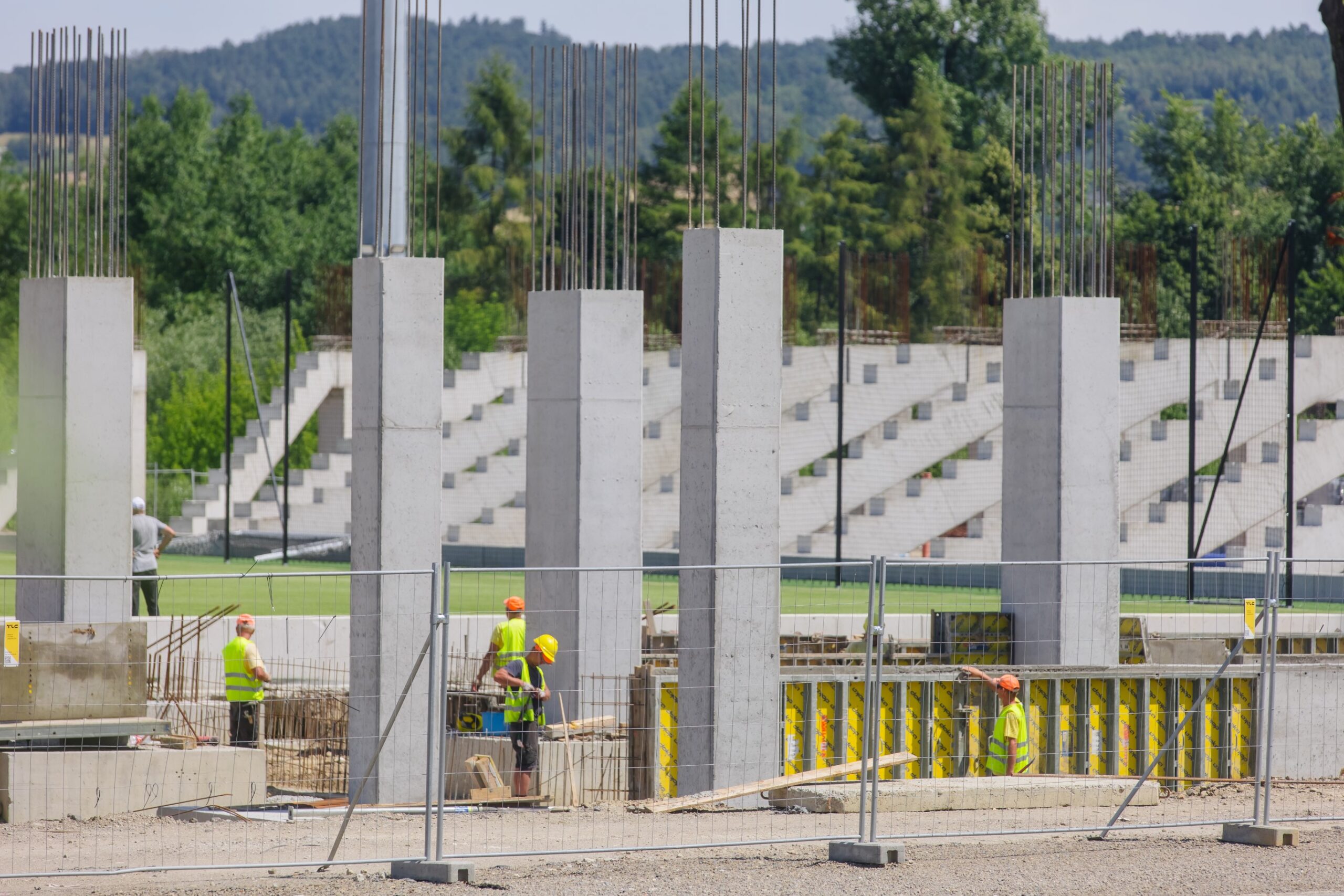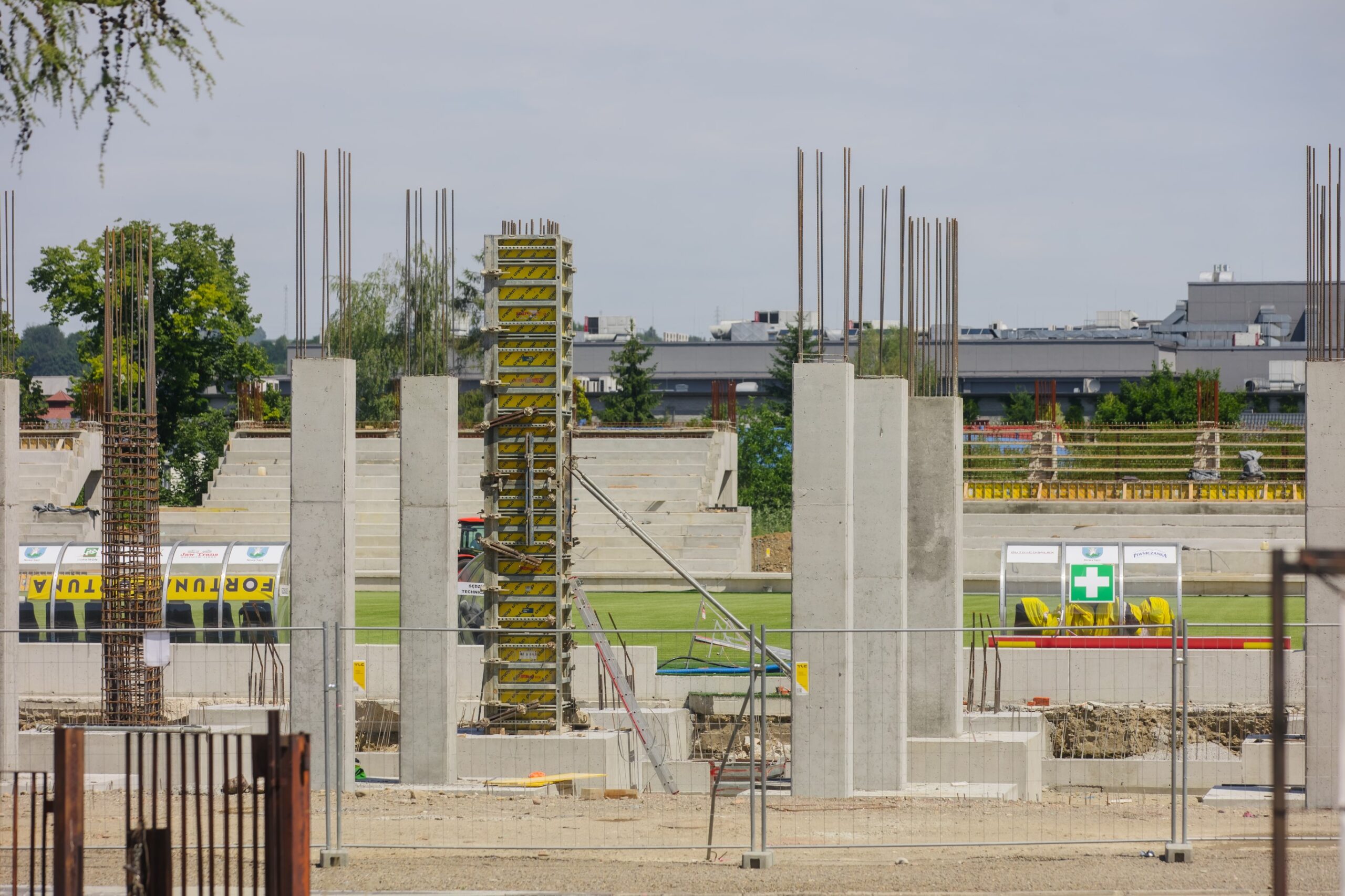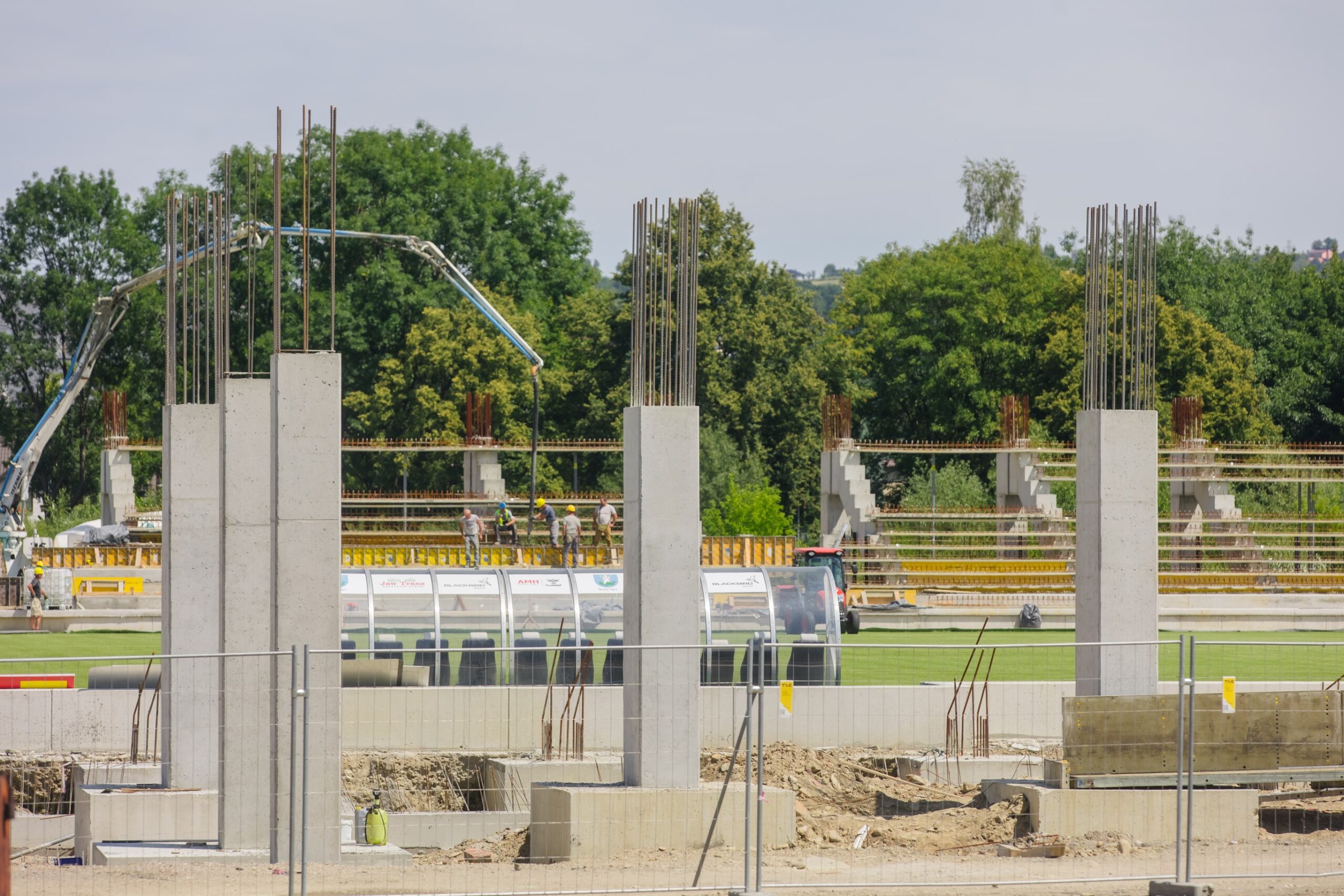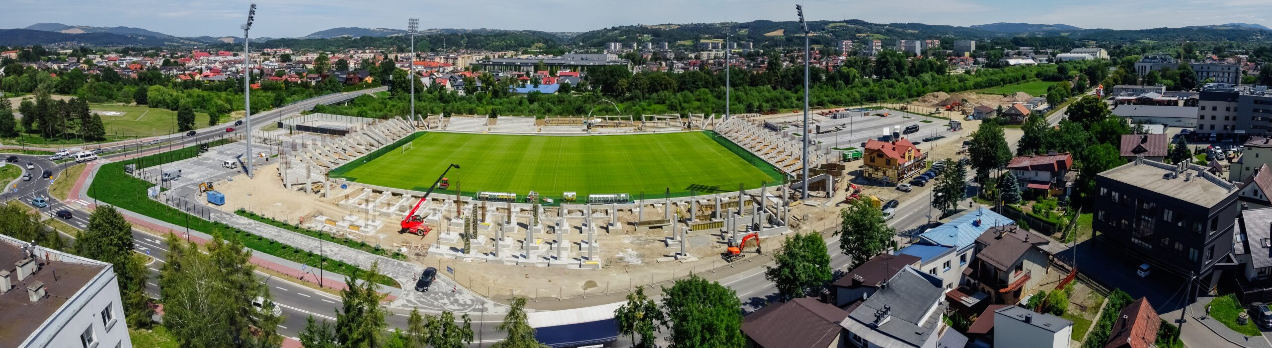 Realizacja stadionu miejskiego w Nowym Sączu wymagała od naszego zespołu precyzyjnego tyczenia skomplikowanej geometrii trybun oraz fundamentów pod maszty oświetleniowe. Nasze wsparcie geodezyjne objęło pełny cykl budowy – od precyzyjnego wytyczenia osi konstrukcyjnych obiektu, przez monitoring osiadań, aż po specjalistyczne pomiary przy profilowaniu płyty boiska pod systemy drenażu i ogrzewania murawy. Wykorzystanie floty dronów (widoczne na ujęciach DJI_0761 i DJI_0762) pozwoliło na bieżący monitoring postępu prac ziemnych i konstrukcyjnych, dostarczając inwestorowi rzetelnych ortofotomap całego placu budowy. Projekt zwieńczyliśmy kompleksową inwentaryzacją powykonawczą całej infrastruktury sportowej i technicznej.
