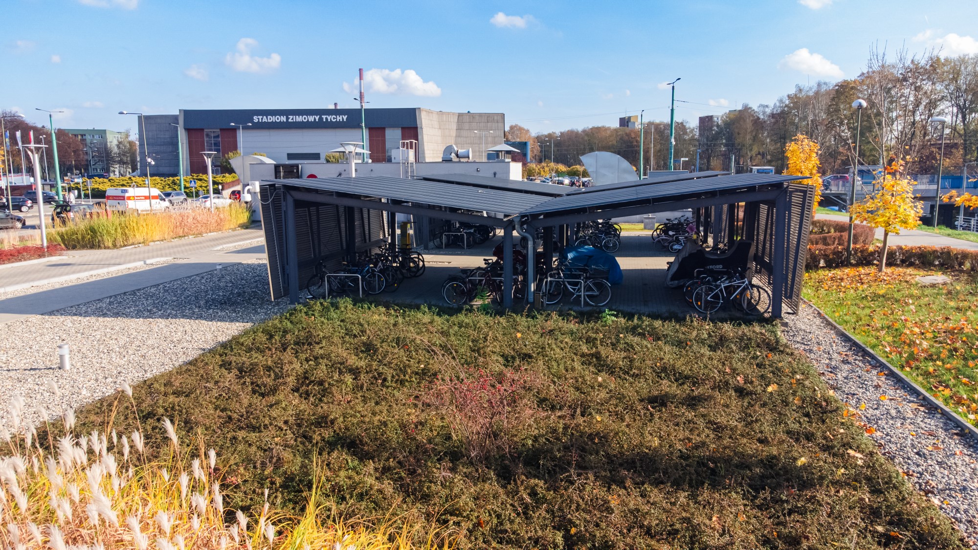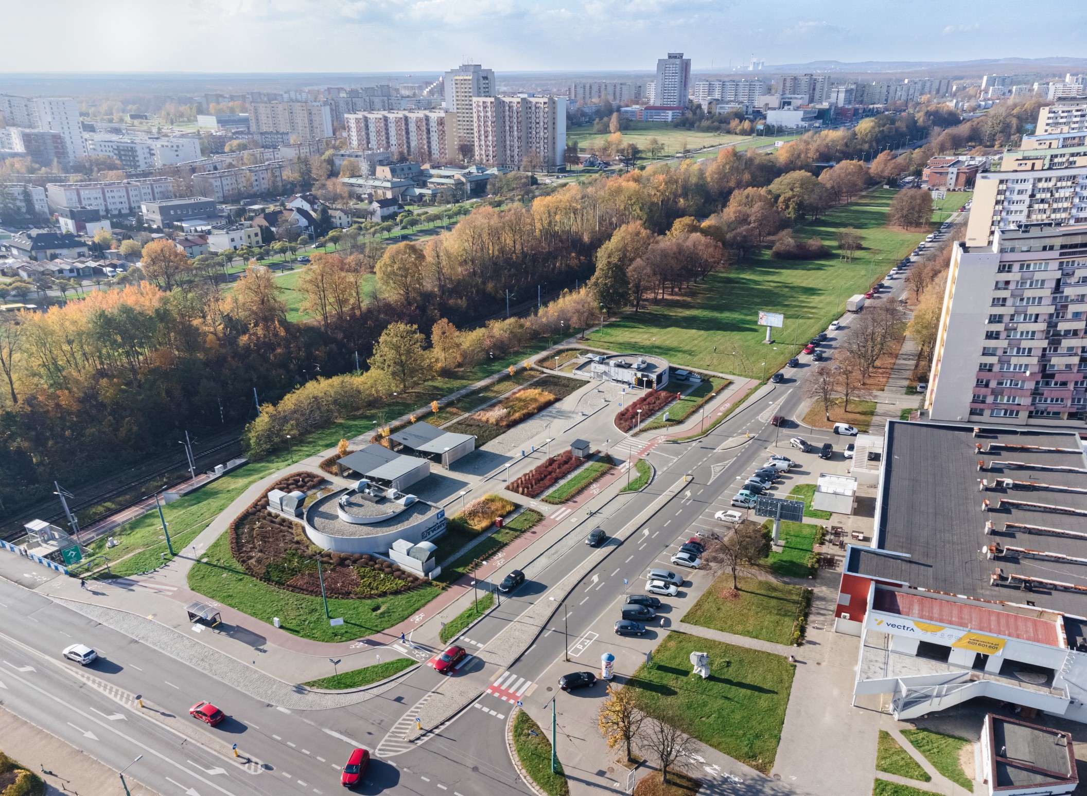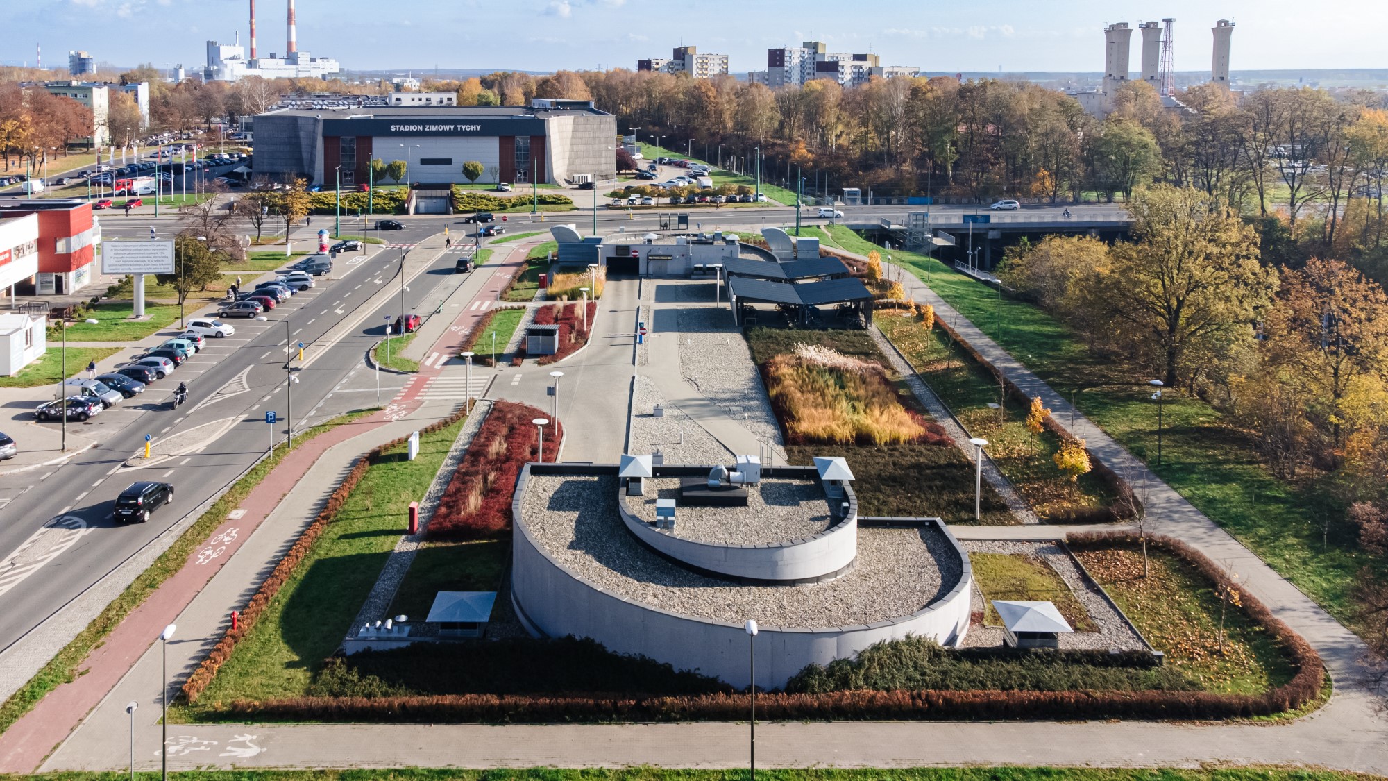 Prace geodezyjne związane z realizacją nowoczesnej przestrzeni parkingowej w Tychach. Obsługa obejmowała wsparcie pomiarowe przy budowie miejsc postojowych, układów drogowych oraz precyzyjnym zagospodarowaniu terenu zielonego wokół obiektu. Ujęcia z drona przedstawiają estetykę wykonanej infrastruktury oraz jej funkcjonalne wkomponowanie w otoczenie miejskie.