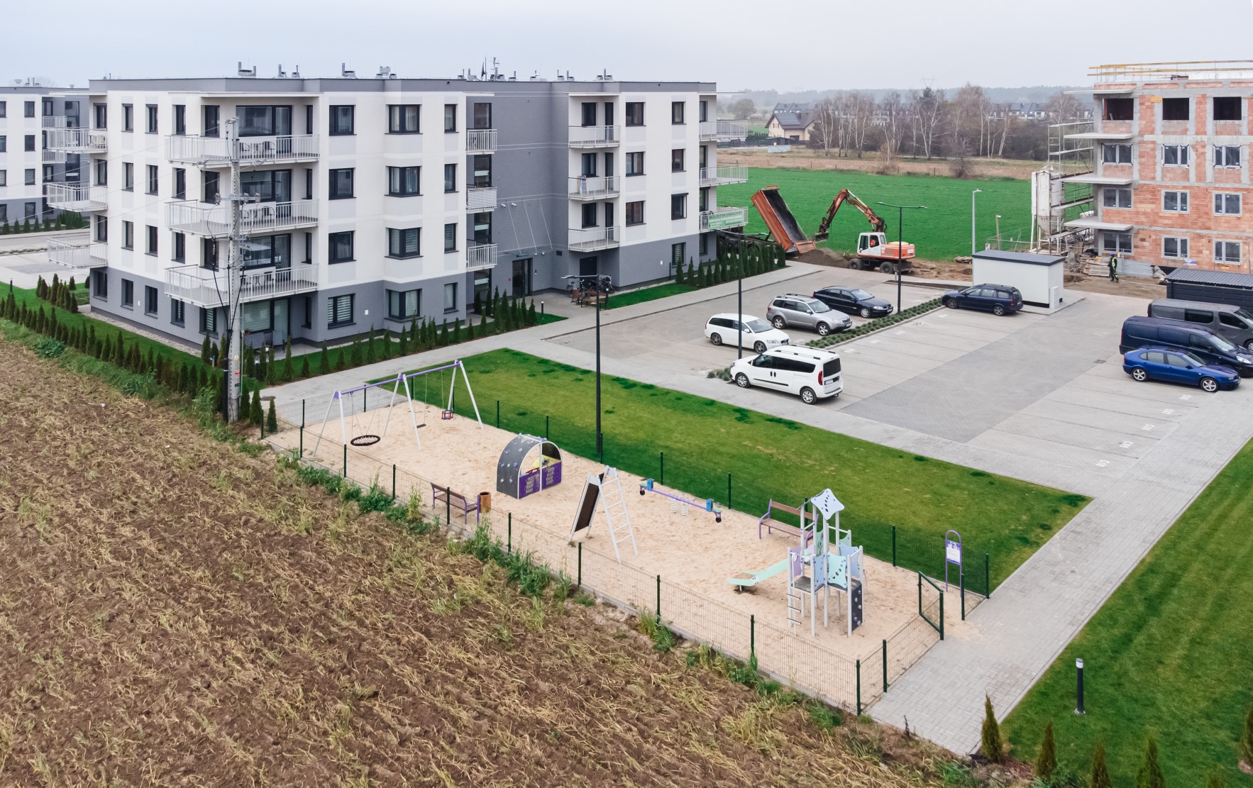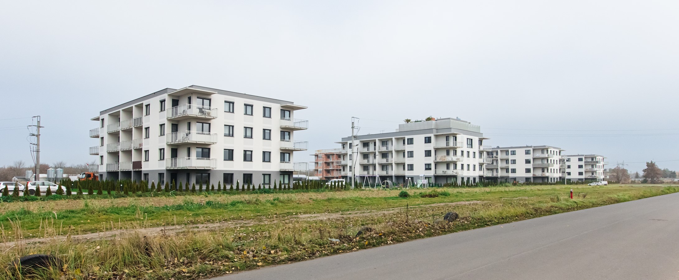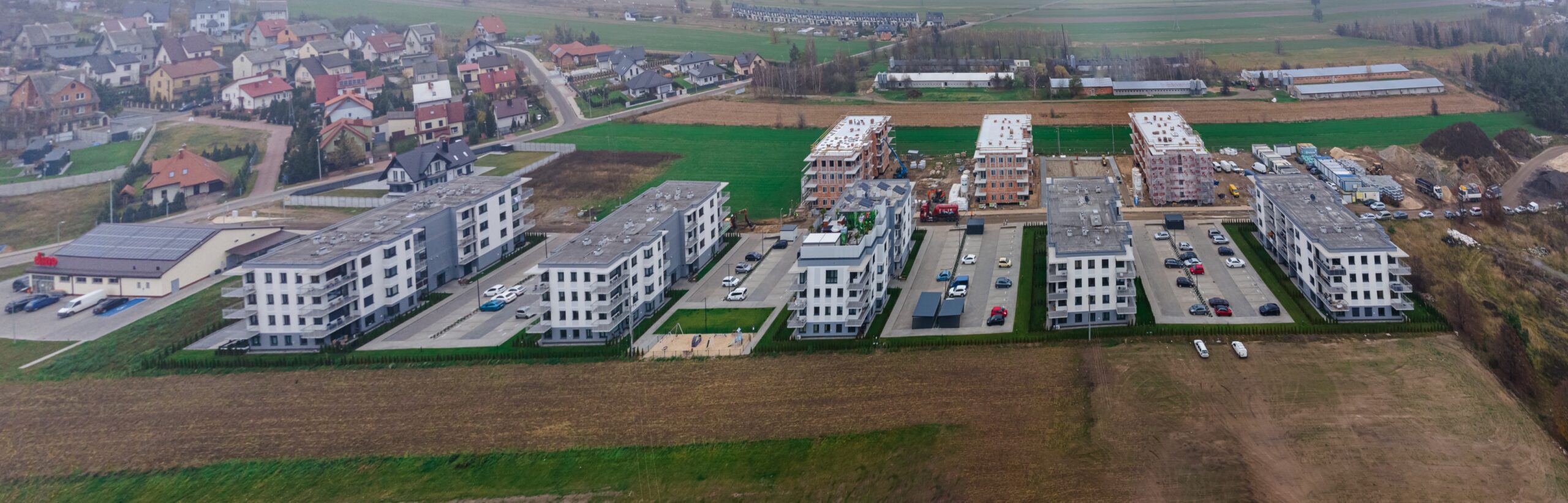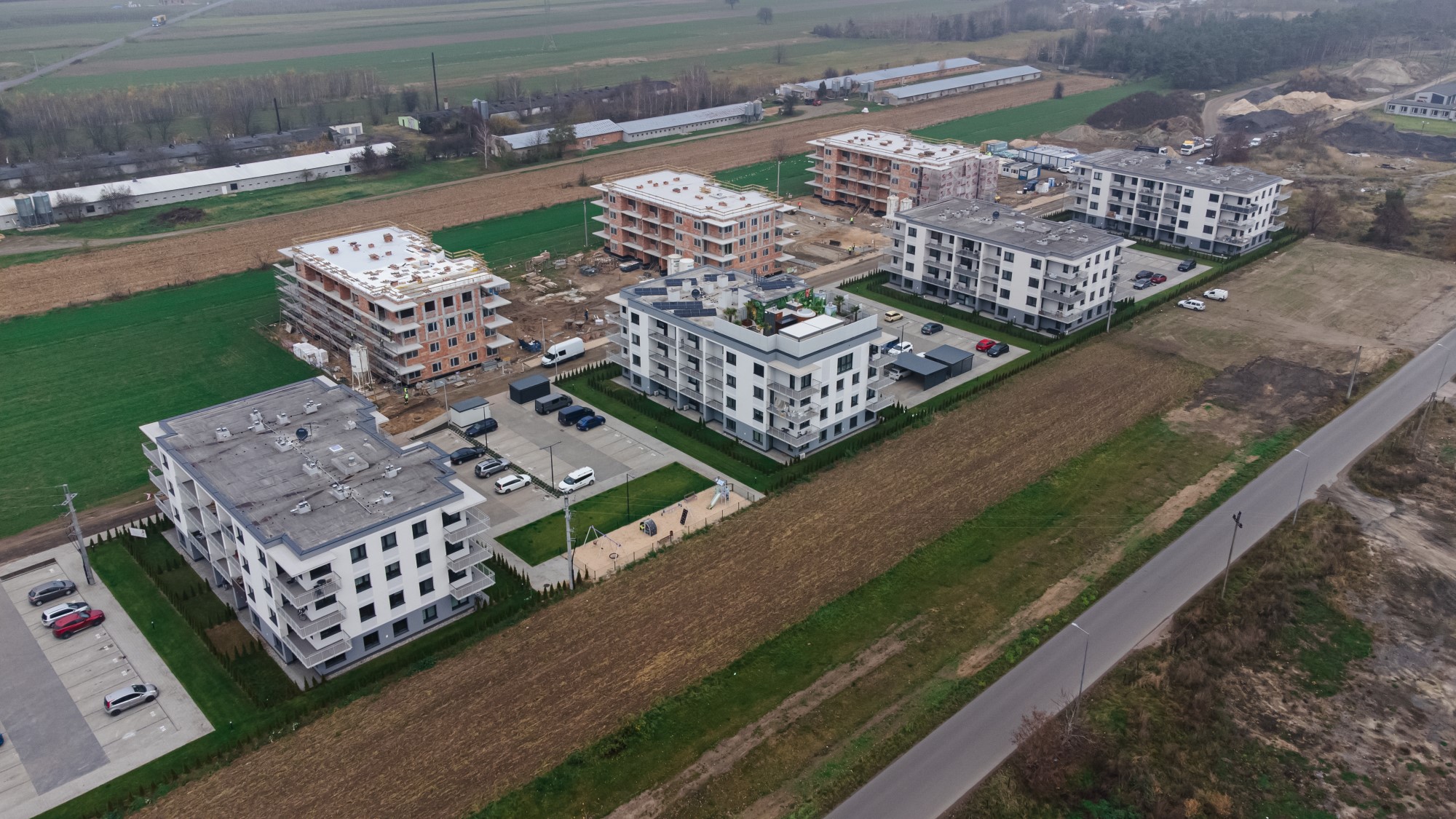 Prace geodezyjne związane z realizacją nowej inwestycji mieszkaniowej w Uniejowie. Projekt obejmował wsparcie pomiarowe przy wznoszeniu budynków wielorodzinnych oraz infrastrukturze towarzyszącej całemu osiedlu. Dokumentacja zdjęciowa przedstawia postępy prac na różnych etapach – od stanu surowego obiektów po fazę wykończeniową i zagospodarowanie terenu.