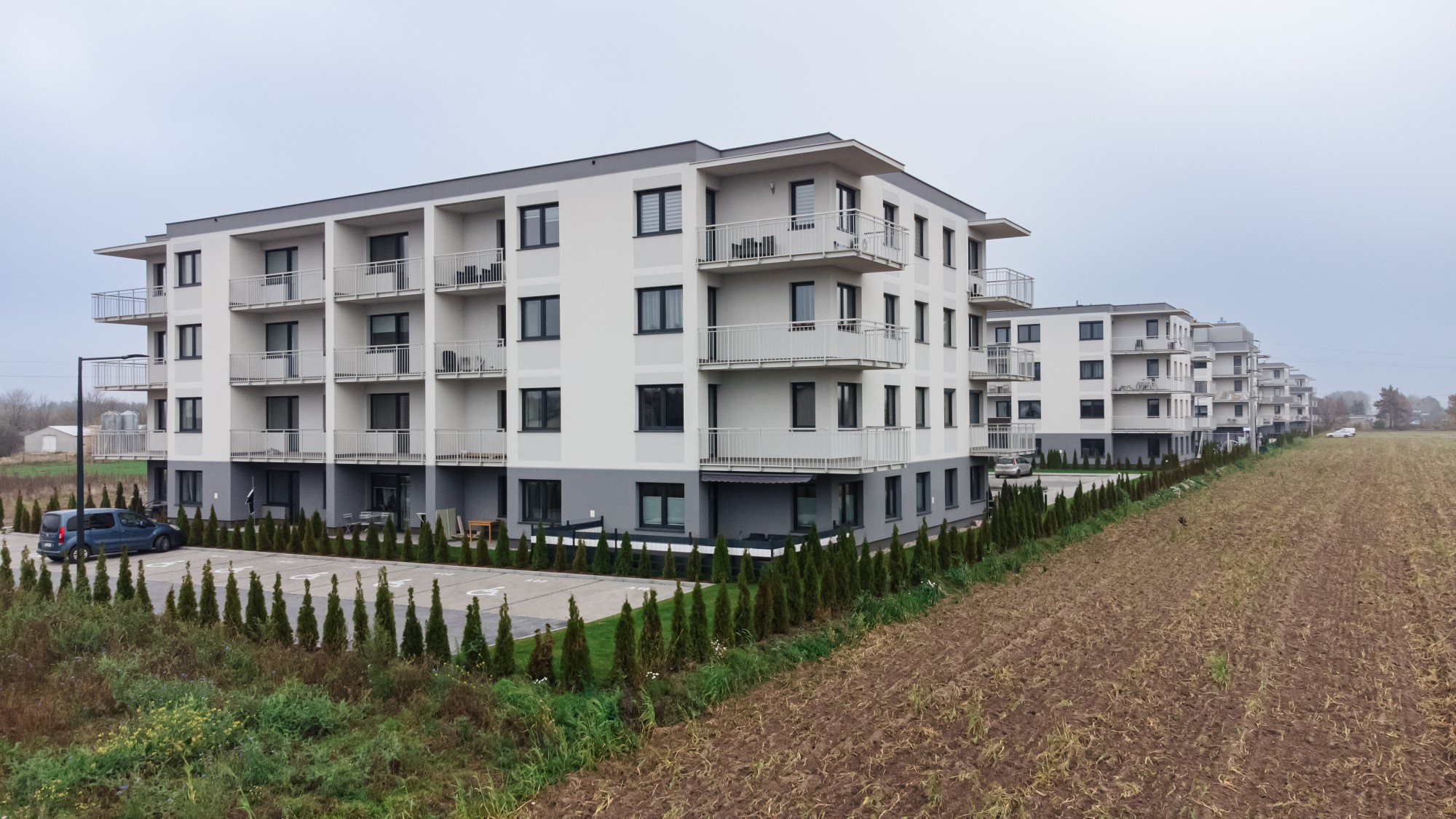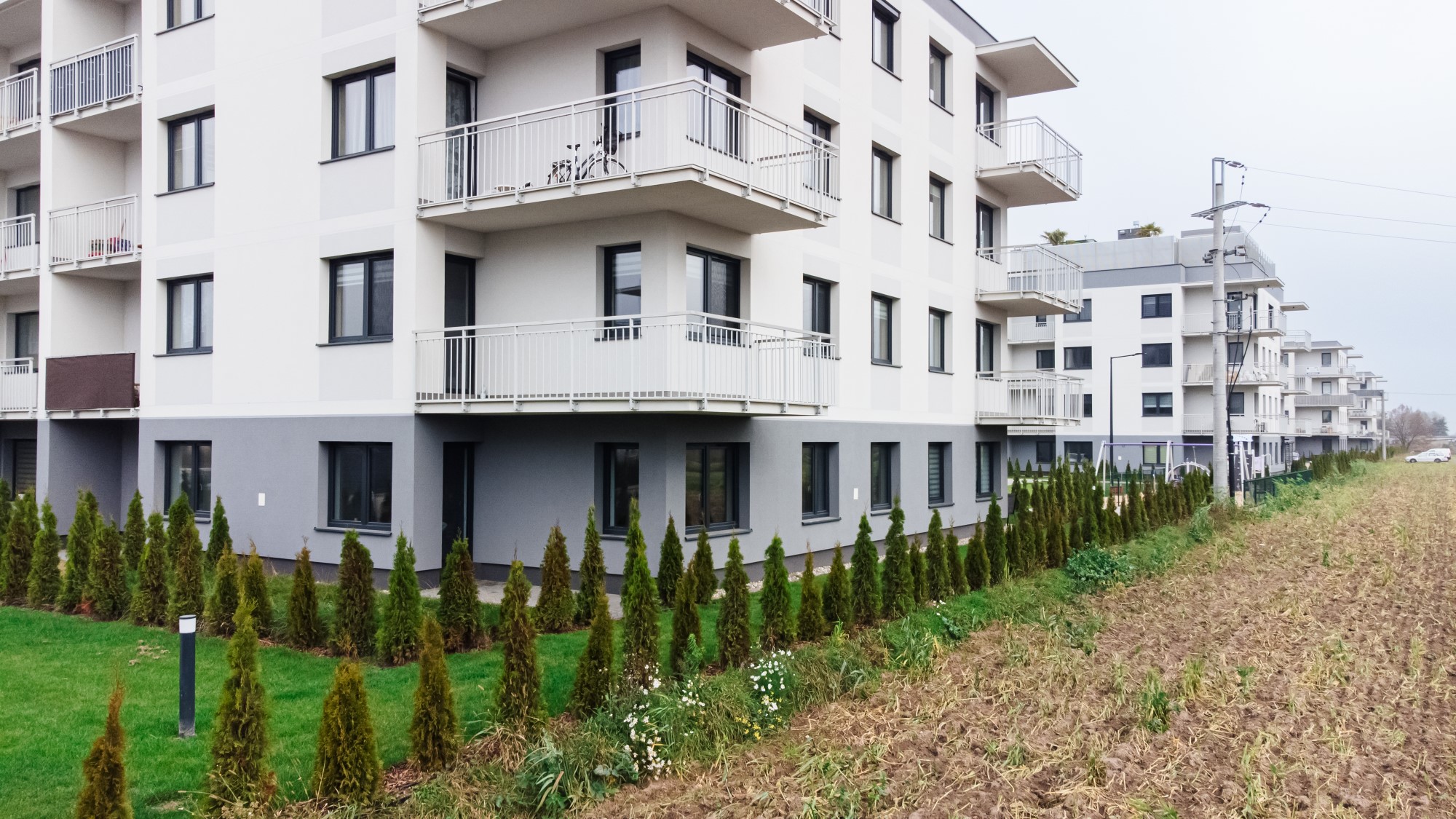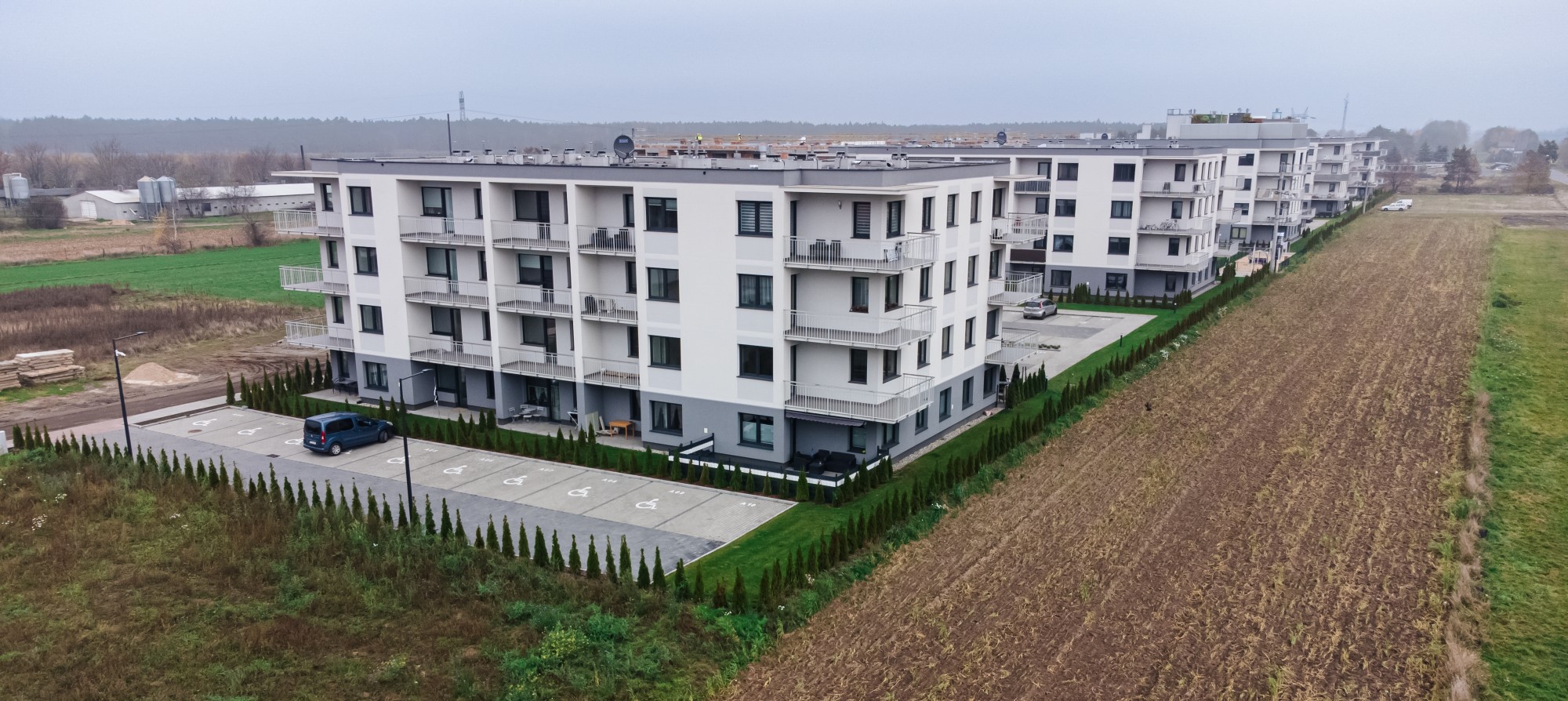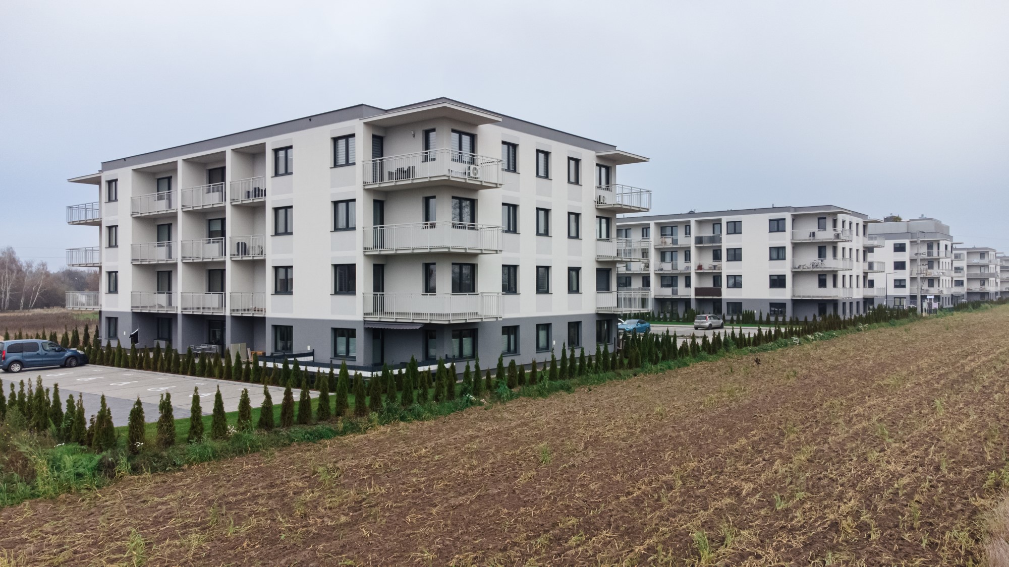 Prace geodezyjne związane z realizacją nowej inwestycji mieszkaniowej w Uniejowie. Projekt obejmował wsparcie pomiarowe przy wznoszeniu budynków wielorodzinnych oraz infrastrukturze towarzyszącej całemu osiedlu. Dokumentacja zdjęciowa przedstawia postępy prac na różnych etapach – od stanu surowego obiektów po fazę wykończeniową i zagospodarowanie terenu.
