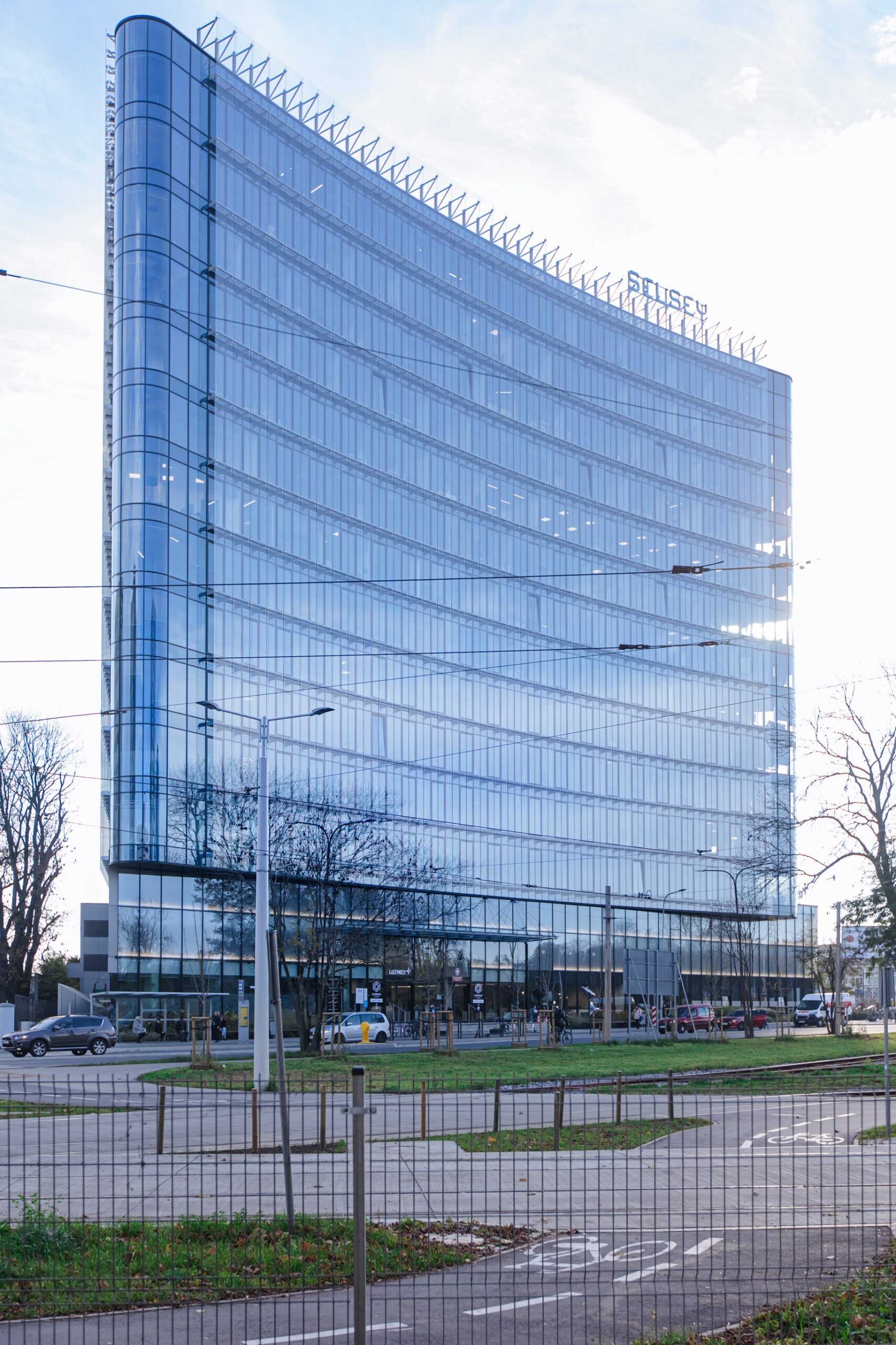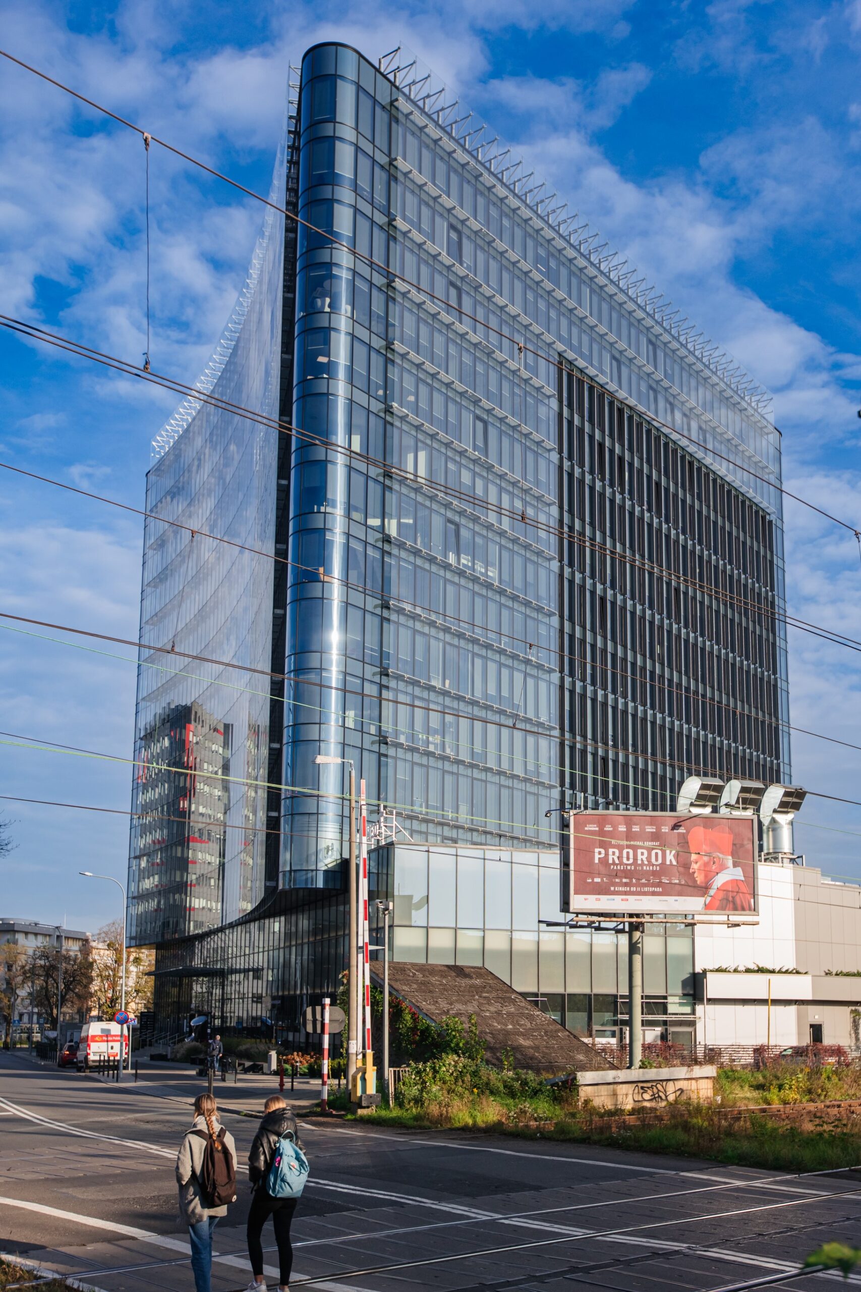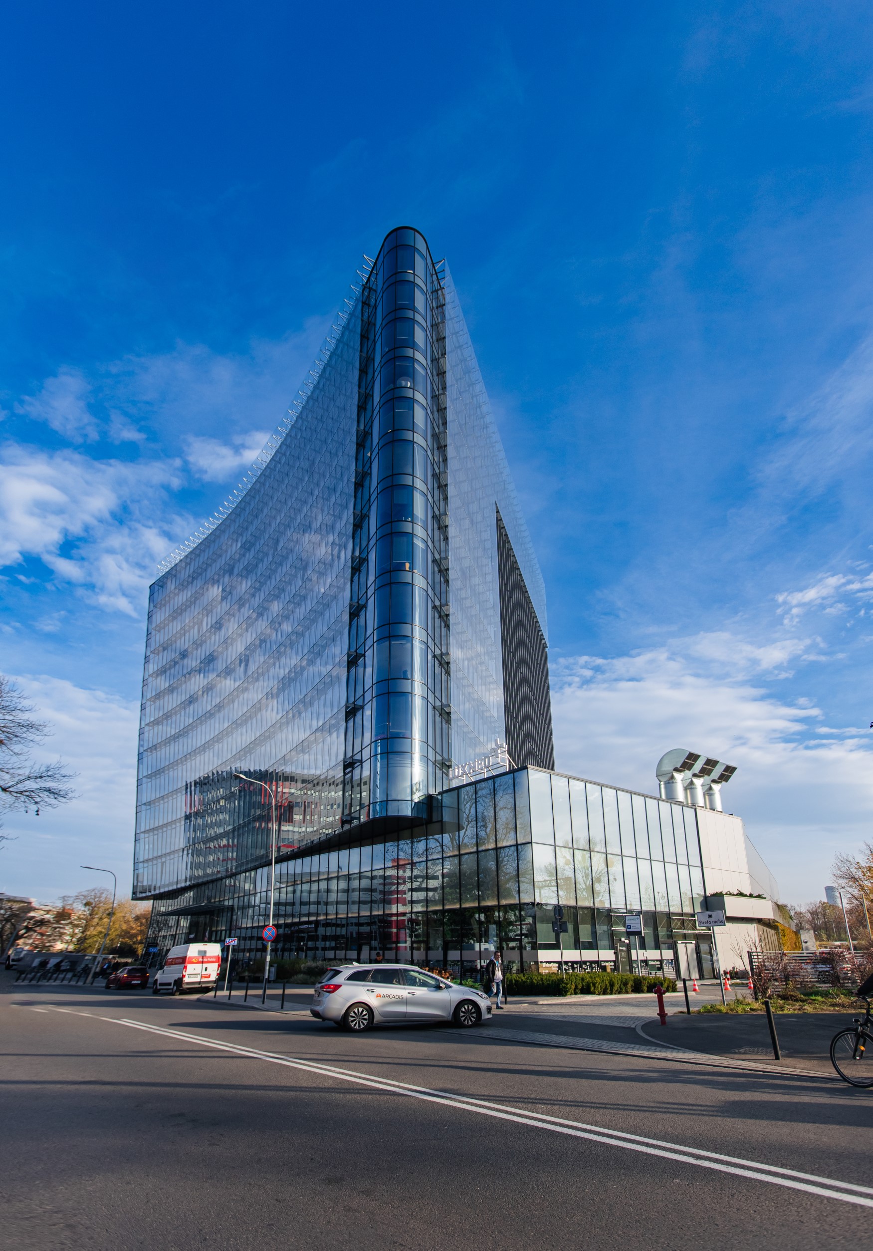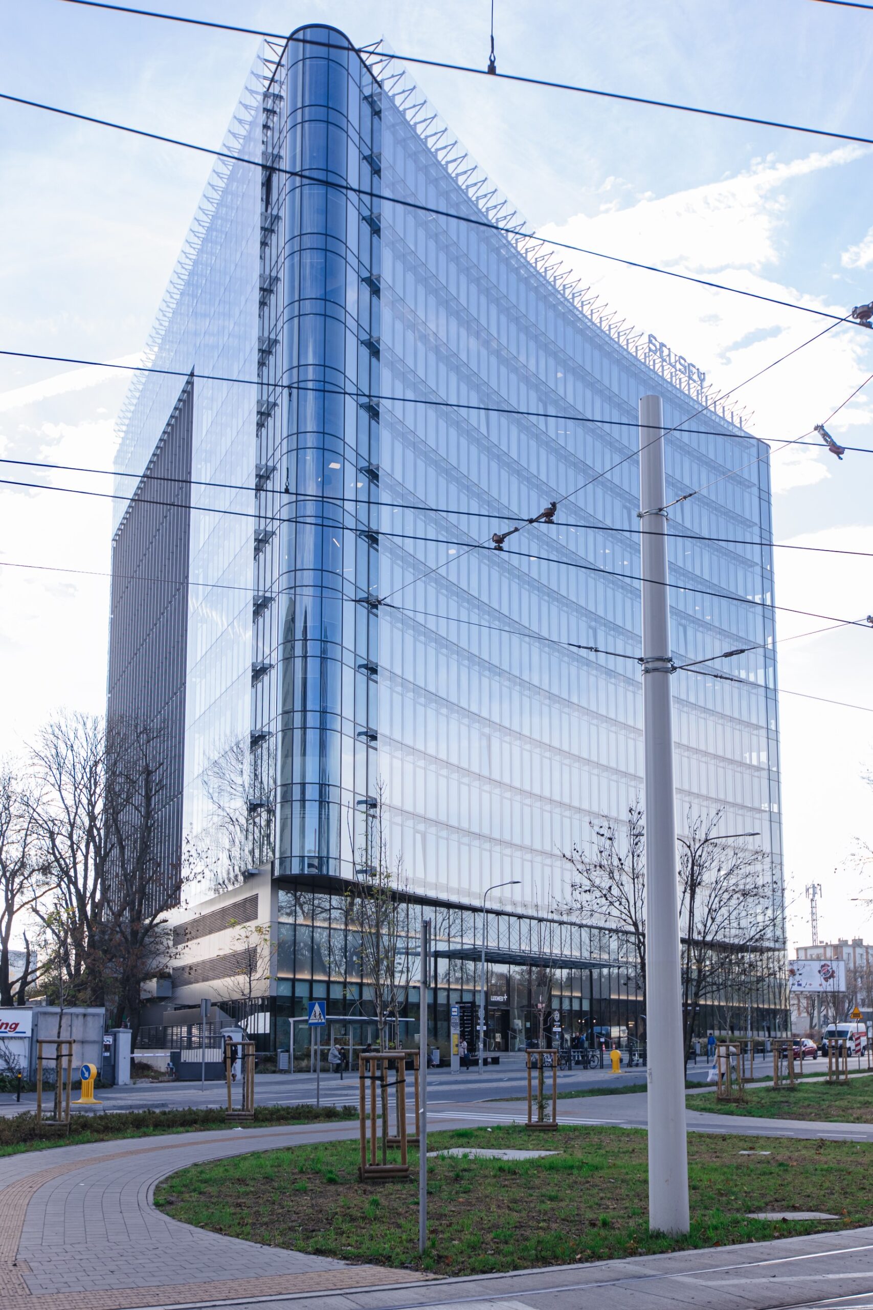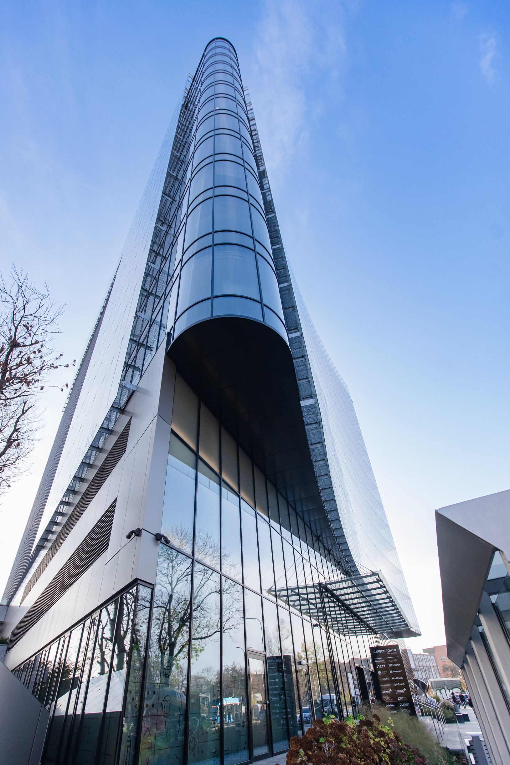 Prace geodezyjne związane z realizacją charakterystycznego biurowca Carbon Tower we Wrocławiu. Projekt obejmował wsparcie pomiarowe przy wznoszeniu obiektu o skomplikowanej bryle i nowoczesnej, szklanej elewacji. Dokumentacja zdjęciowa przedstawia gotowy budynek, kładąc nacisk na jego unikalną geometrię oraz detale konstrukcyjne fasady, które wymagały precyzyjnego nadzoru geodezyjnego.